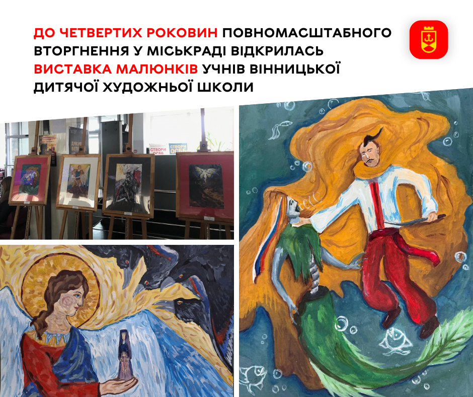 У холі Вінницької міської ради відкрилася виставка творчих робіт учнів Вінницької дитячої художньої школи під назвою «Боротьба добра зі злом». Експозиція приурочена до четвертих роковин повномасштабного вторгнення рф на територію України.