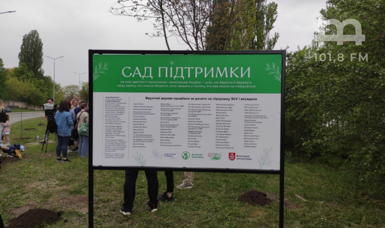 «Організаторами акції стали «Вінницязеленбуд», «Dekoplant», Фонд громади «Подільська громада» за підтримки Департаменту маркетингу міста та туризму Вінницької міської ради. За три дні від початку акції нам вдалося закрити збір. Люди долучались для того, щоб підтримати ЗСУ. За ці кошти будуть куплені дрони. Ця локація є дуже доречною: поруч озеро. Люди зможуть приходити, відпочивати тут разом з дітками і куштувати смачні плоди».