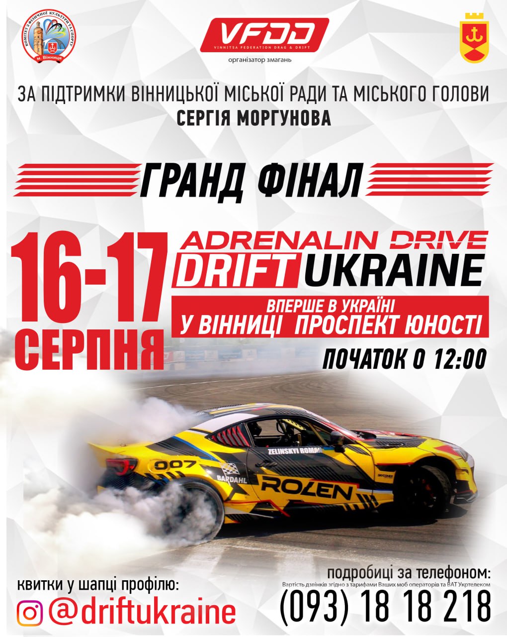 Як повідомляють на сайті Вінницької міської ради, 16-17 серпня у Вінниці відбудеться фінальний етап чемпіонату ADRENALIN DRIVE DRIFTUKRAINE. Вперше в історії українських дріфт-змагань професійна траса проляже від вулиці Андрія Первозванного до музею-садиби М.І. Пирогова. Глядачі зможуть побачити заїзди найшвидших драйверів країни, а ще долучитися до доброї справи: під час заходу збиратимуть кошти на підтримку Збройних сил України. Організатор – Вінницька федерація дрегрейсингу та дріфту (VFDD), за підтримки Вінницької міської ради та міського голови Сергія Моргунова.