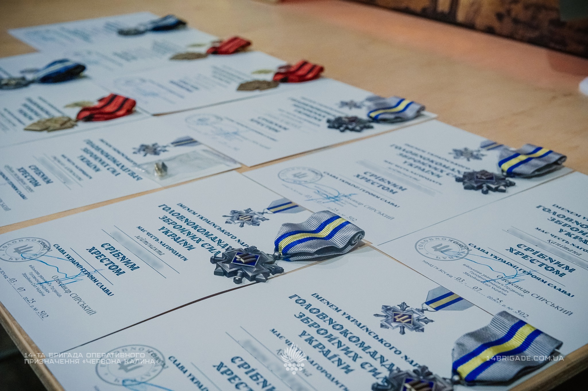 Командир бригади полковник Олег Мироненко вручив нагороди бійцям, які проявили себе в боях на Покровському напрямку. Бійці отримали нагрудні знаки «Срібний хрест», «За доблесть», «За відвагу, «За сумлінну службу» та «Хрест хоробрих». Бійцям також вручили бригадні медалі «Червона Калина».
