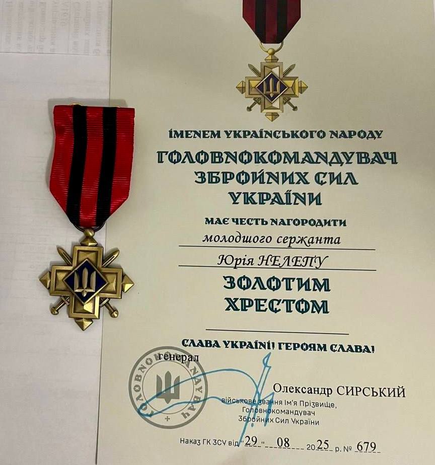 Цього разу Юрія Нелепу відзначили почесним нагрудним знаком Головнокомандувача Збройних сил України “Золотий хрест”, який вручають за мужність, успішне виконання бойових завдань, видатні вчинки та високі результати у бойовій підготовці, йдеться у тг-каналі Бершадської громади.