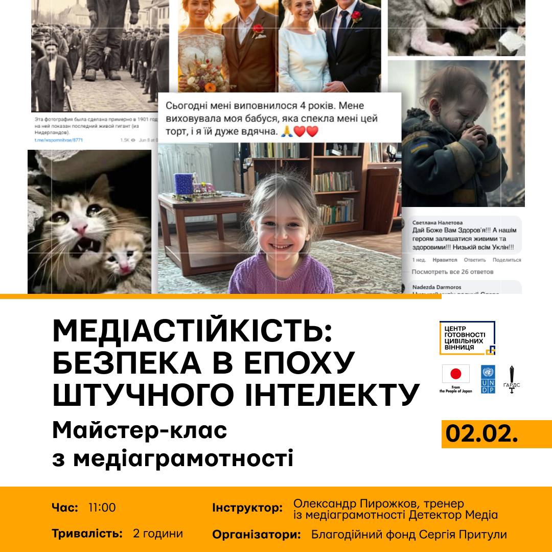 Майстер-клас із медіаграмотності "Медіаоборона: безпека в епоху штучного інтелекту: як розпізнати, як протидіяти фейкам та як використовувати ШІ-штучний інтелект в хороших цілях" організовує Благодійний фонд Сергія Притули спільно з ГО "Ґардс".