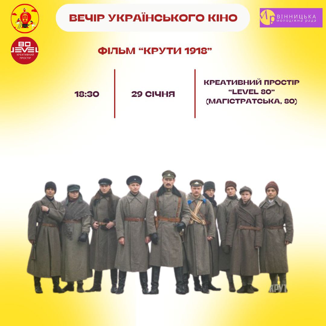 Як зазначається на сайті Вінницької міської ради, відділ молодіжної політики муніципалітету запрошує на спеціальний перегляд українського історичного фільму «Крути 1918».