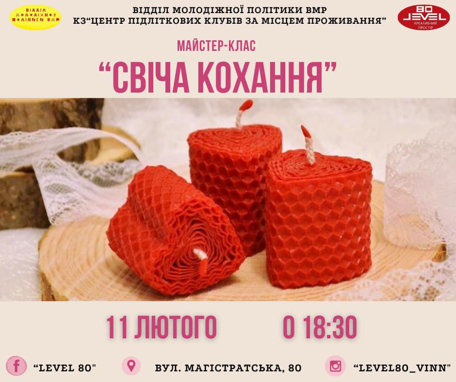 Майстер-клас, на якому учасники зможуть створити власні унікальні свічки з вощини, відбудеться 11 лютого в креативному просторі «Level 80»