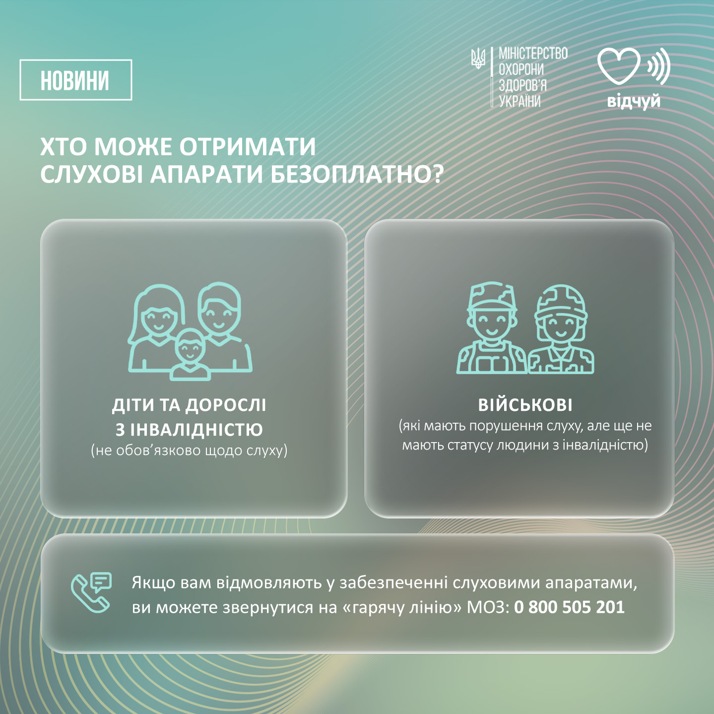 Слухові апарати можуть безоплатно отримати діти й дорослі з інвалідністю та військовослужбовці, які мають порушення слуху, але ще не мають статусу людини з інвалідністю.