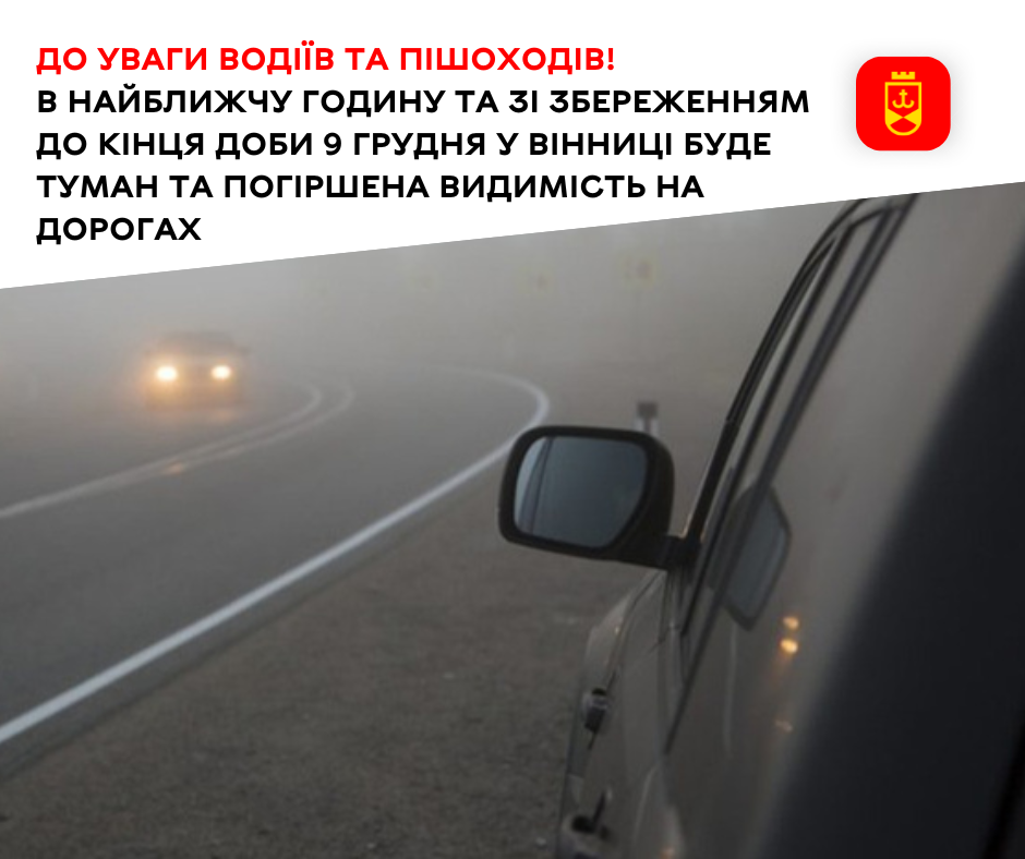 Містян попереджають: до кінця доби 9 грудня у Вінниці буде туман та погіршена видимість на дорогах