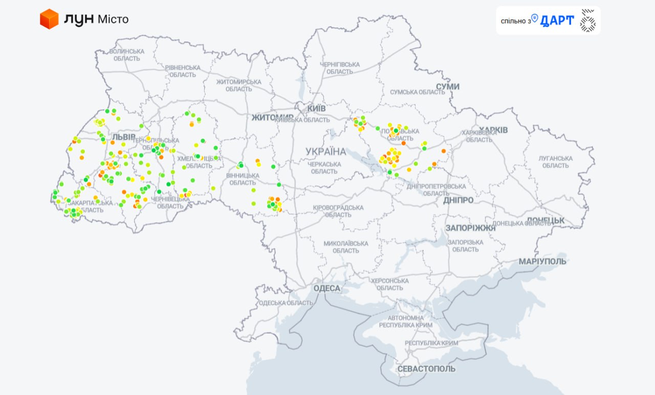 Найбільш інклюзивні локації позначені зеленим кольором, найменш безбарʼєрні – червоним.