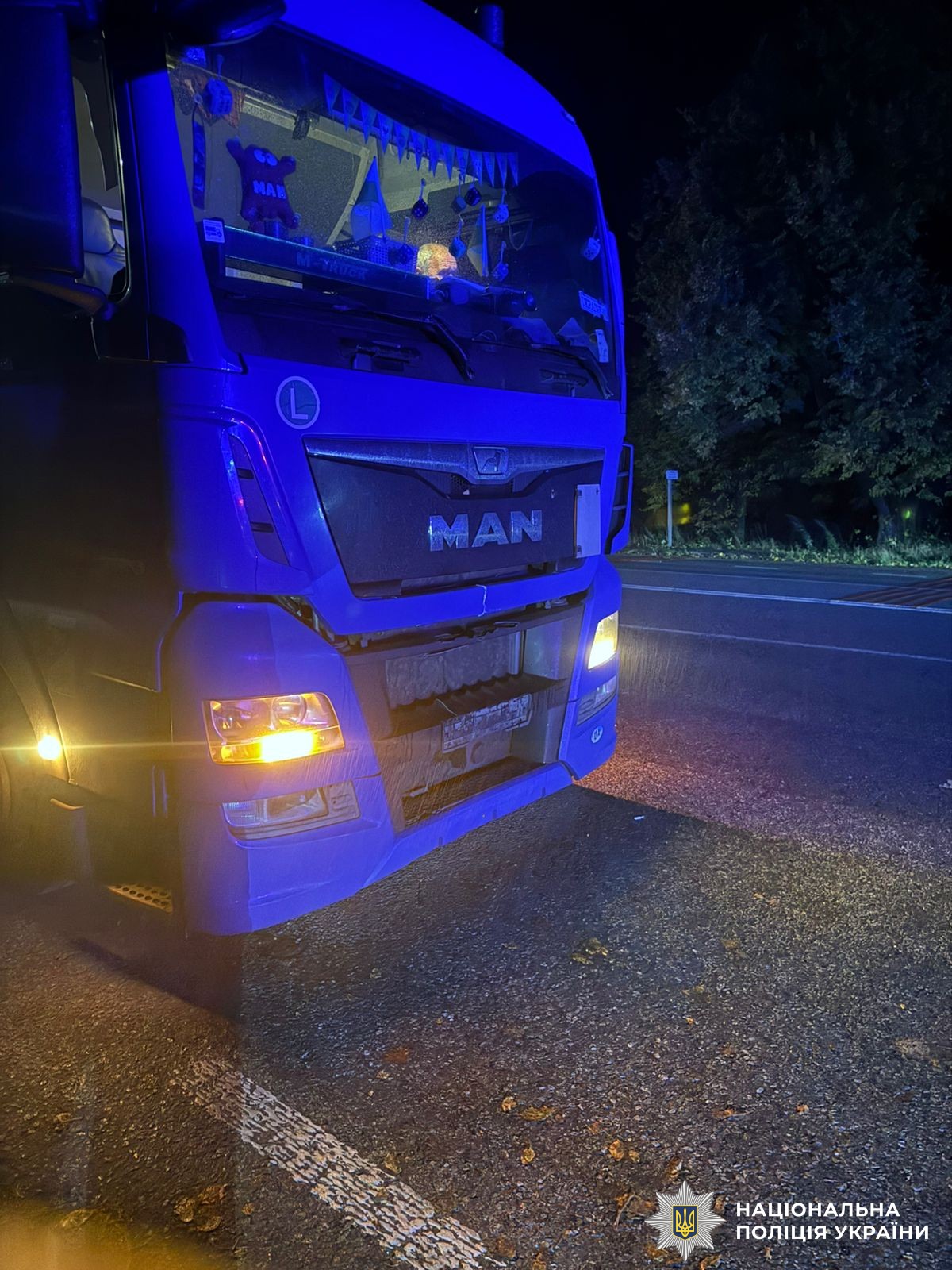 Тоді водій вантажівки MAN, 58-річний житель Хмельницької області, наїхав на жінку, яка рухалася проїзною частиною дороги поза межами пішохідного переходу. Від отриманих травм потерпіла загинула на місці події. Її особу встановлюють правоохоронці.