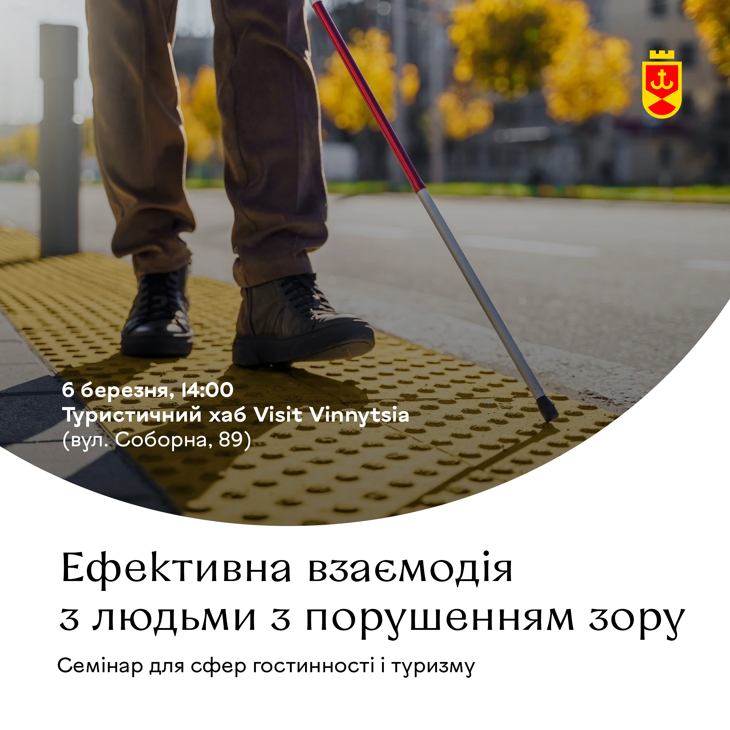Як повідомляють на сайті Вінницької міської ради, 6 березня відбудеться семінар на тему: «Ефективна взаємодія з людьми порушенням зору». До участі запрошують представників вінницьких закладів харчування, розміщення та дозвілля, які зацікавлені у створенні доступного середовища і сервісу.