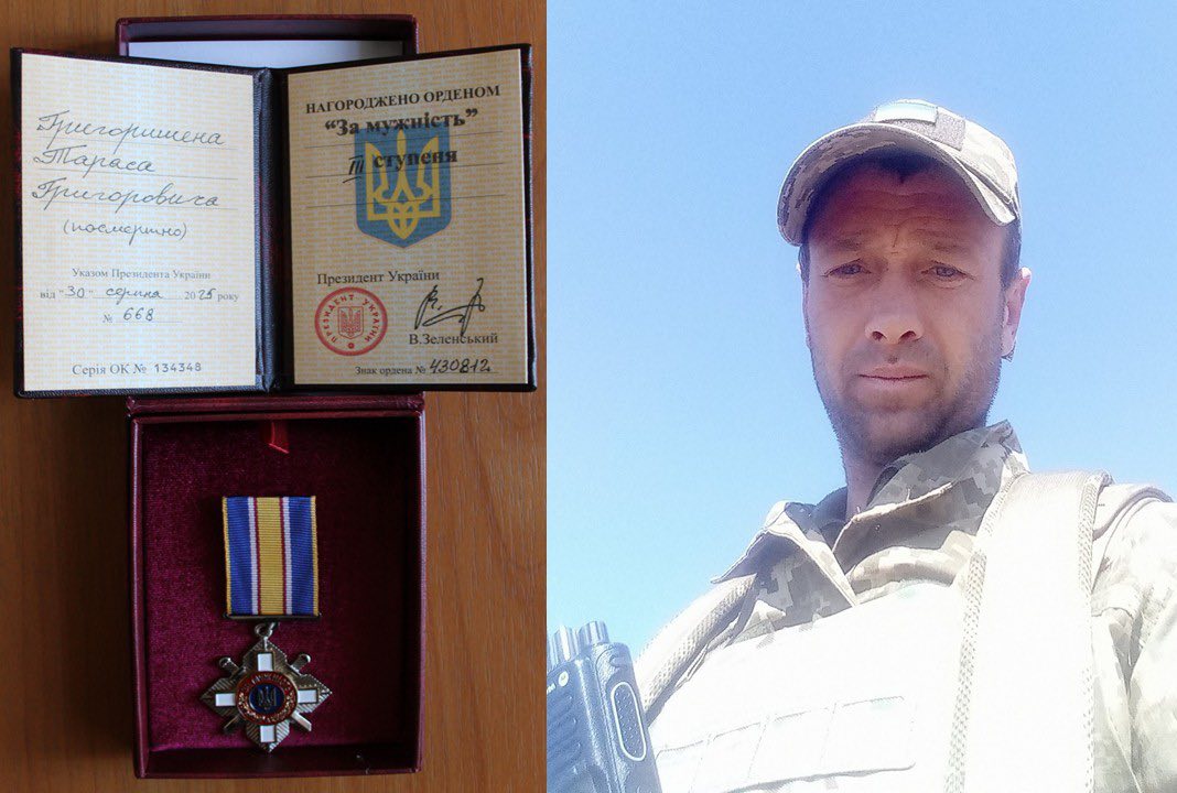 Солдат Тарас Григоришен, стрілець-санітар військової частини А4689, загинув 1 липня 2023 року під час виконання бойового завдання внаслідок мінометного обстрілу противником. Згідно з Указом Президента України від 30 серпня 2025 року №668 нагороджений орденом «За мужність» ІІІ ступеня (посмертно). Нагороду вручено матері — Тетяні Володимирівні.