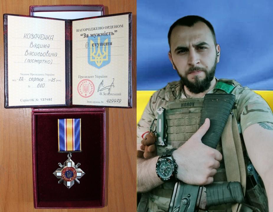 Молодший сержант Вадим Козаченко проходив службу у військовій частині А7085, був командиром відділення безпілотних авіаційних комплексів. Вірний військовій присязі, загинув 14 березня 2025 року під час ведення бойових дій у районі населеного пункту Катеринівка, Донецької області. Указом Президента України від 22 серпня 2025 року №610 нагороджений орденом «За мужність» ІІІ ступеня (посмертно). Нагороду вручено матері — Валентині Василівні.