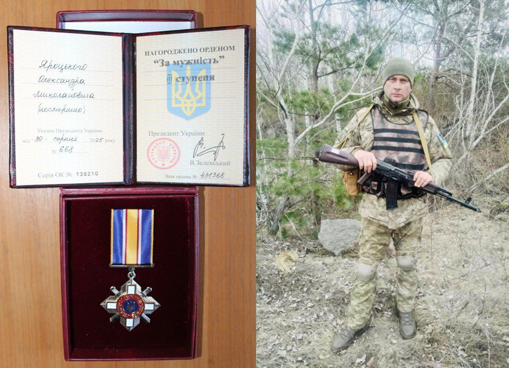Старший солдат Олександр Яроцький, головний сержант 2 стрілецького взводу 1 стрілецької роти 411 окремого стрілецького батальйону, проявив стійкість і мужність у бою за нашу Батьківщину та загинув 12 січня 2024 року від отриманих травм на полі бою. Указом Президента України від 30 серпня 2025 року №668 нагороджений орденом «За мужність» ІІ ступеня (посмертно). Нагороду вручено дружині — Надії Михайлівні.