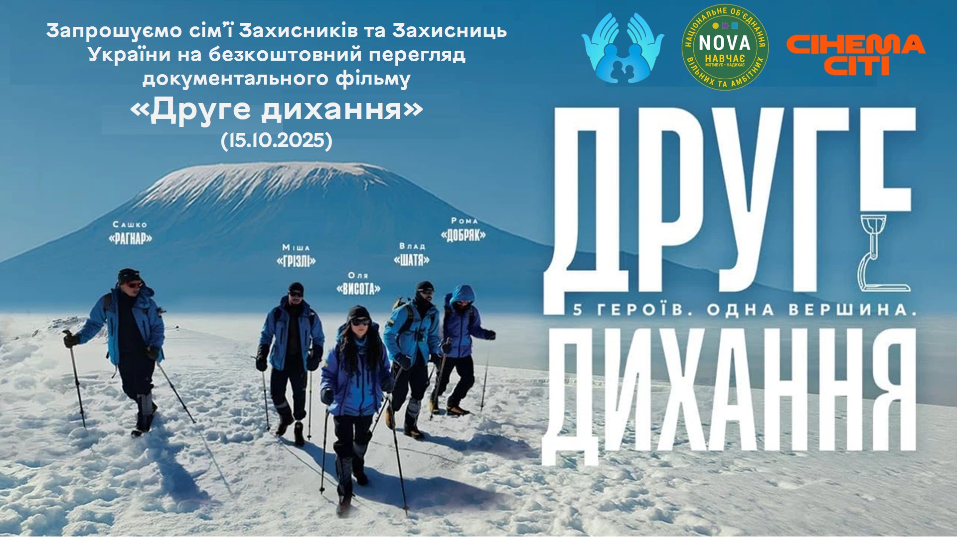 Як зазначається на сайті Вінницької міської ради, 15 жовтня відбудеться безкоштовний перегляд документального фільму «Друге дихання» режисерки Марії Кондакової для родин Захисників і Захисниць. Це стрічка про чотирьох героїв із досвідом ампутацій та героїню із пораненням, які здійснили сходження на найвищу гору Африки – Кіліманджаро.