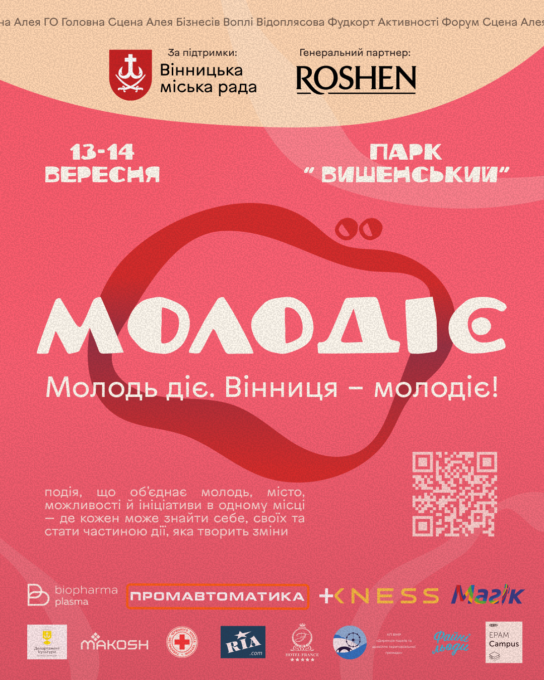 Як повідомляють на сайті Вінницької міської ради, громадська організація «Молодь 3.0» у співпраці із Департаментом культури за підтримки Вінницької міської ради ініціює проведення молодіжного заходу «МолоДіє», присвяченого Дню міста. Подія відбудеться у вихідні, 13-14 вересня. Мета — об’єднати молодь, місто, ініціативи та можливості в одному просторі, де кожен зможе знайти себе, однодумців і стати частиною спільноти, що творить зміни. На всіх охочих чекають у парку Вишенський, з 10:00 до 21:30. Важлива місія події – підтримка Збройних сил України.