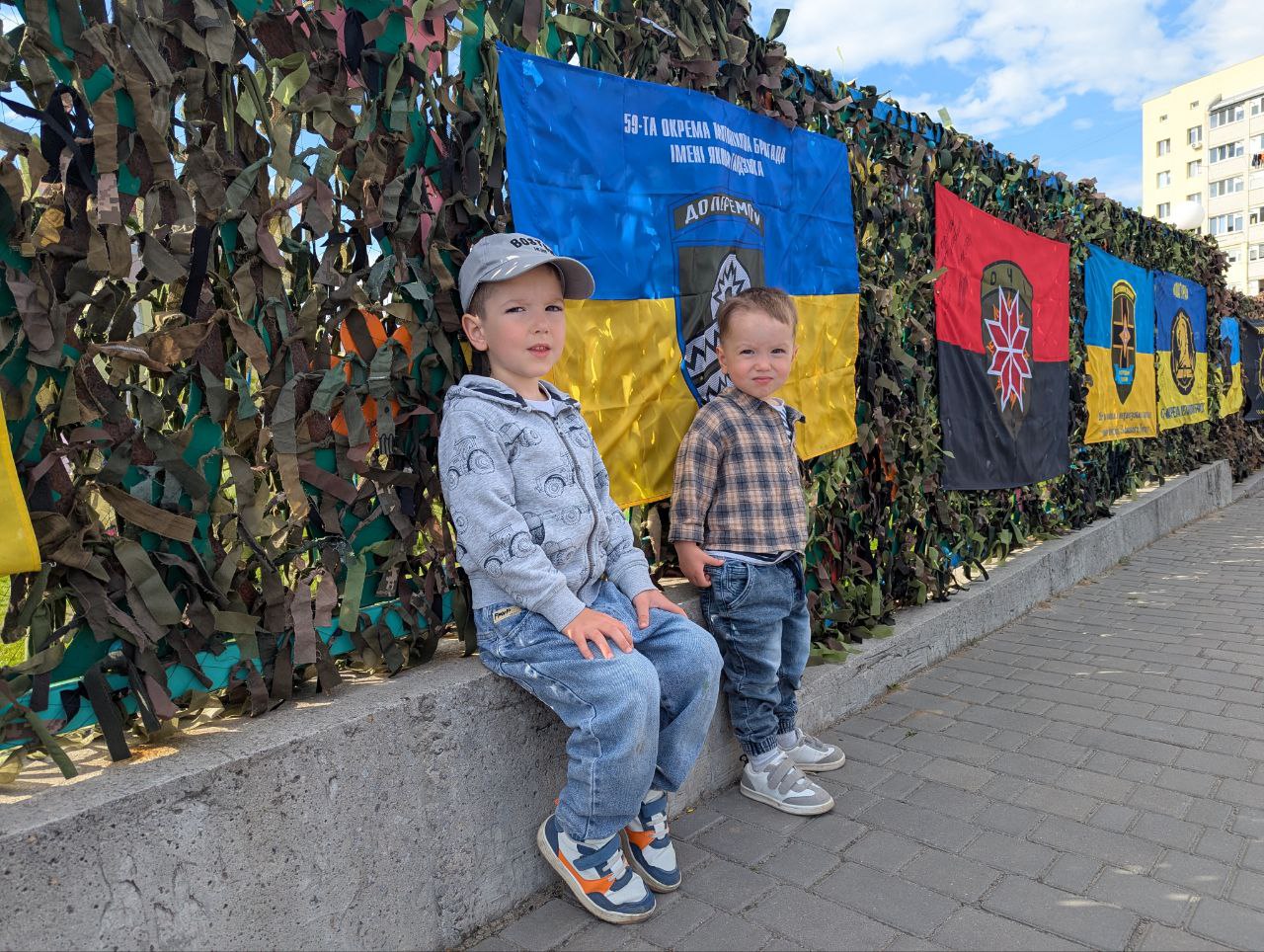 Тут усе в дусі патріотизму. Навколо – прапори українських військових частин, які передали волонтери з передової. Під час відкриття ярмарку діти тримали руку на серці під звуки Державного Гімну України.