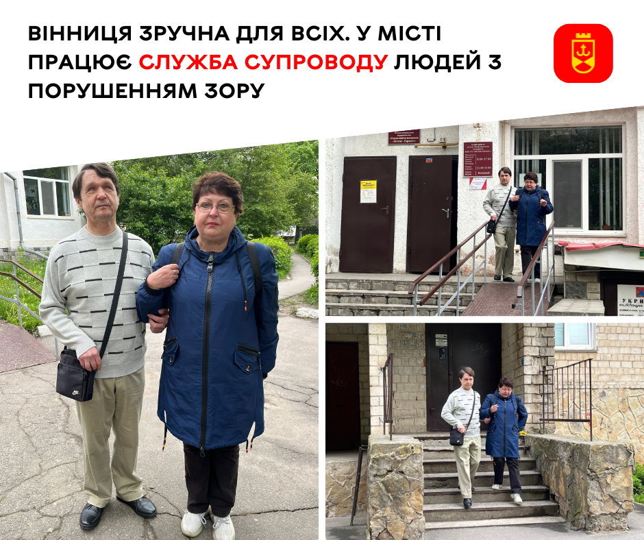 Як зазначається на сайті Вінницької міської ради, на базі міського терцентру працює служба супроводу людей з інвалідністю по зору І групи. Соціальні робітники супроводжують вінничан з порушеннями зору до лікарень, аптек, магазинів, адміністративних установ тощо. Це – приклад реальної безбар’єрності в дії, коли місто створює умови для комфортного та безпечного пересування всіх мешканців, у тому числі тих, хто бачить цей світ у темряві.