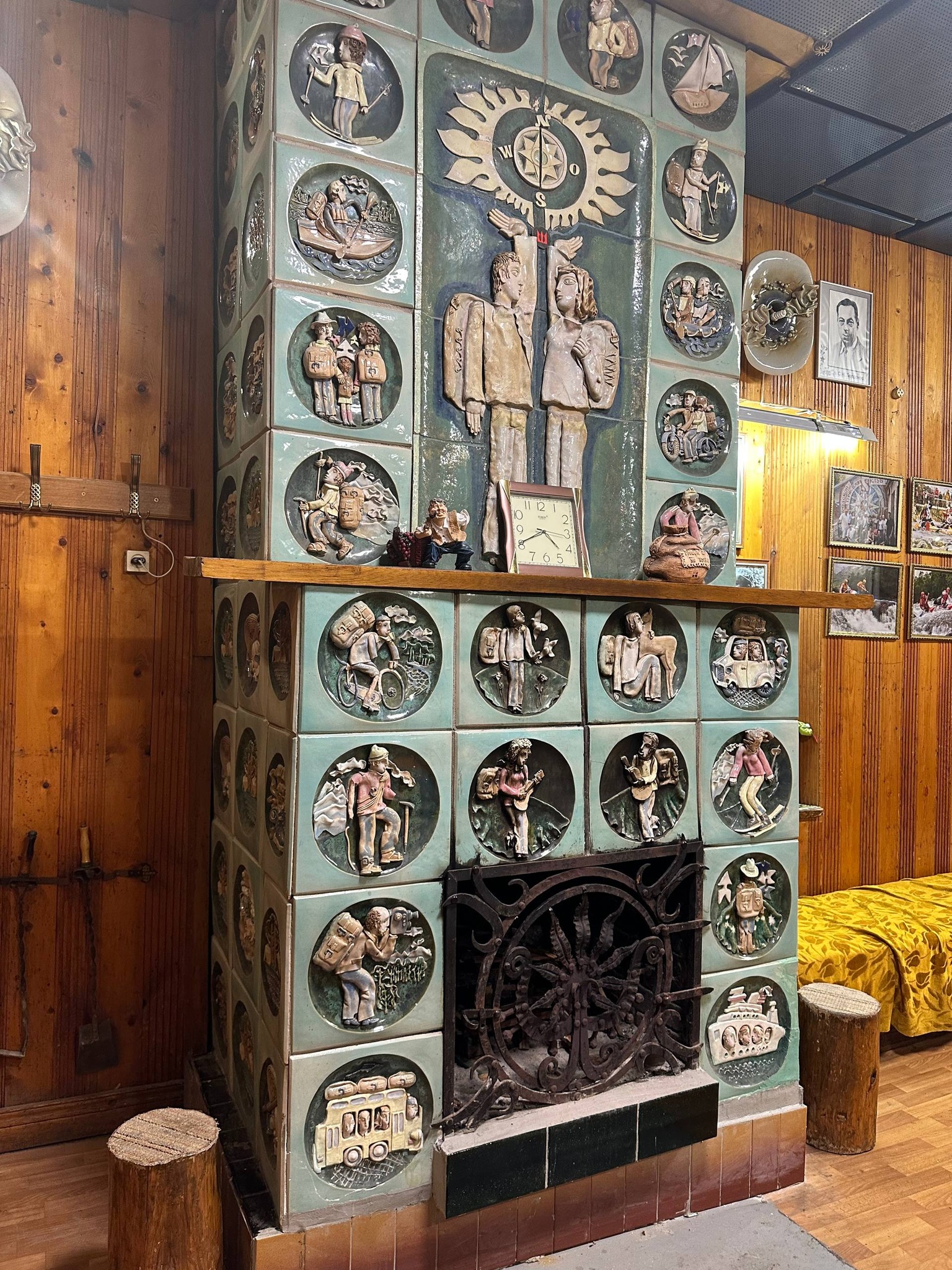 "Камін оздоблений керамічними кахлями зелених відтінків. Кожна така кахля каміну оформлена унікальною декоративно-сюжетною композицією. На фронтальній частині розміщені неповторні сюжети, присвячені різним видам туризму, а обидві бокові частини каміну прикрашені рельєфними зображеннями природного ландшафту та туристичного спорядження. По центру на димоході розміщена велика символічна композиція, на якій виліплені хлопець і дівчина — мандрівники з піднятими руками до сонця з компасом", - розповідають у Бюро охорони культурної спадщини.