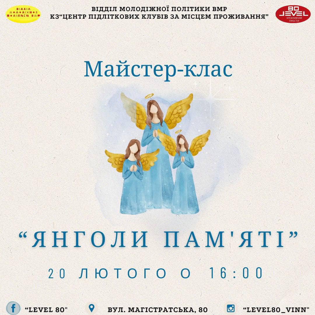 Як зазначається на сайті Вінницької міської ради, 20 лютого о 16:00 в Креативному просторі «LEVEL 80» відбудеться майстер-клас, присвячений пам'яті Героїв Небесної Сотні. Цей захід надасть учасникам можливість висловити свою вдячність тим, хто віддав своє життя за майбутнє України.