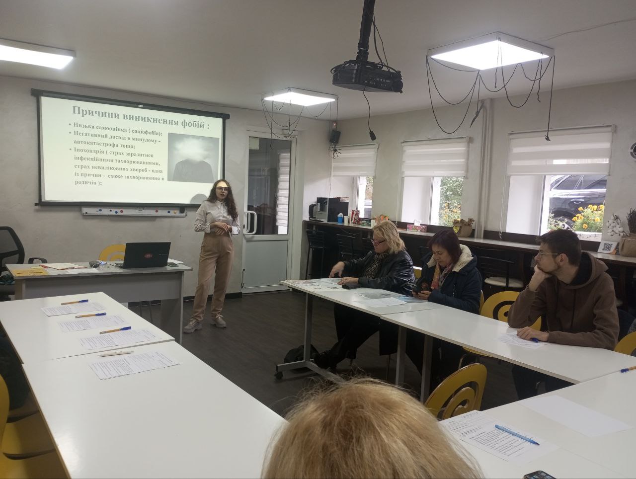 Під час заходу також обговорили найпоширеніші типи фобій: агорафобію – страх відкритих просторів і натовпу, клаустрофобію – страх замкнутих приміщень, а також соціофобію, що може заважати спілкуванню. Особливу увагу приділили страхам, які з’явилися через війну – страху вибухів, поранень чи втрати.