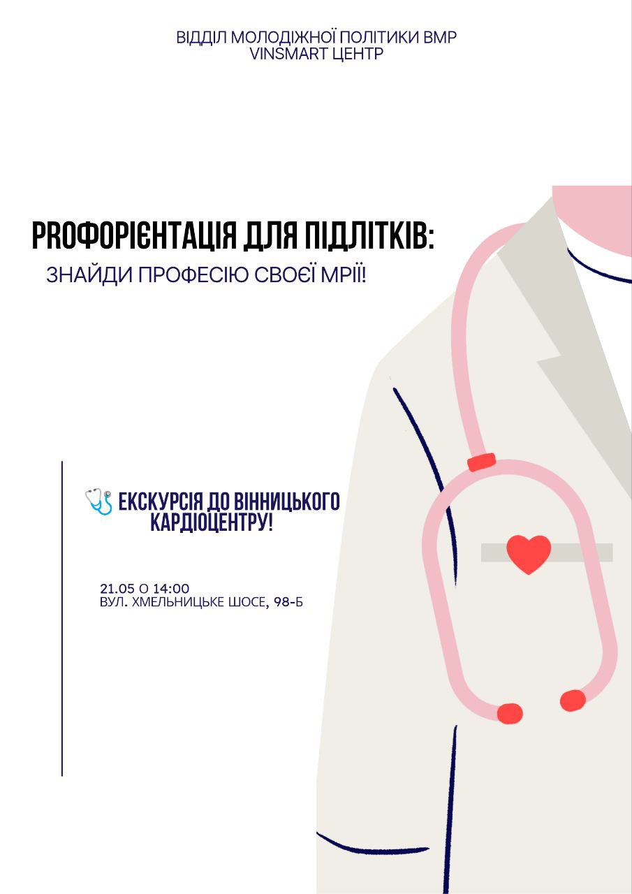 Як зазначається на сайті Вінницької міської ради, 21 травня відбудеться перший захід у межах нової профорієнтаційної ініціативи, організованої відділом молодіжної політики Вінницької міської ради спільно з VinSmart Центром. Учасники візьмуть участь в ознайомчій екскурсії до Вінницького регіонального центру серцево-судинної патології.