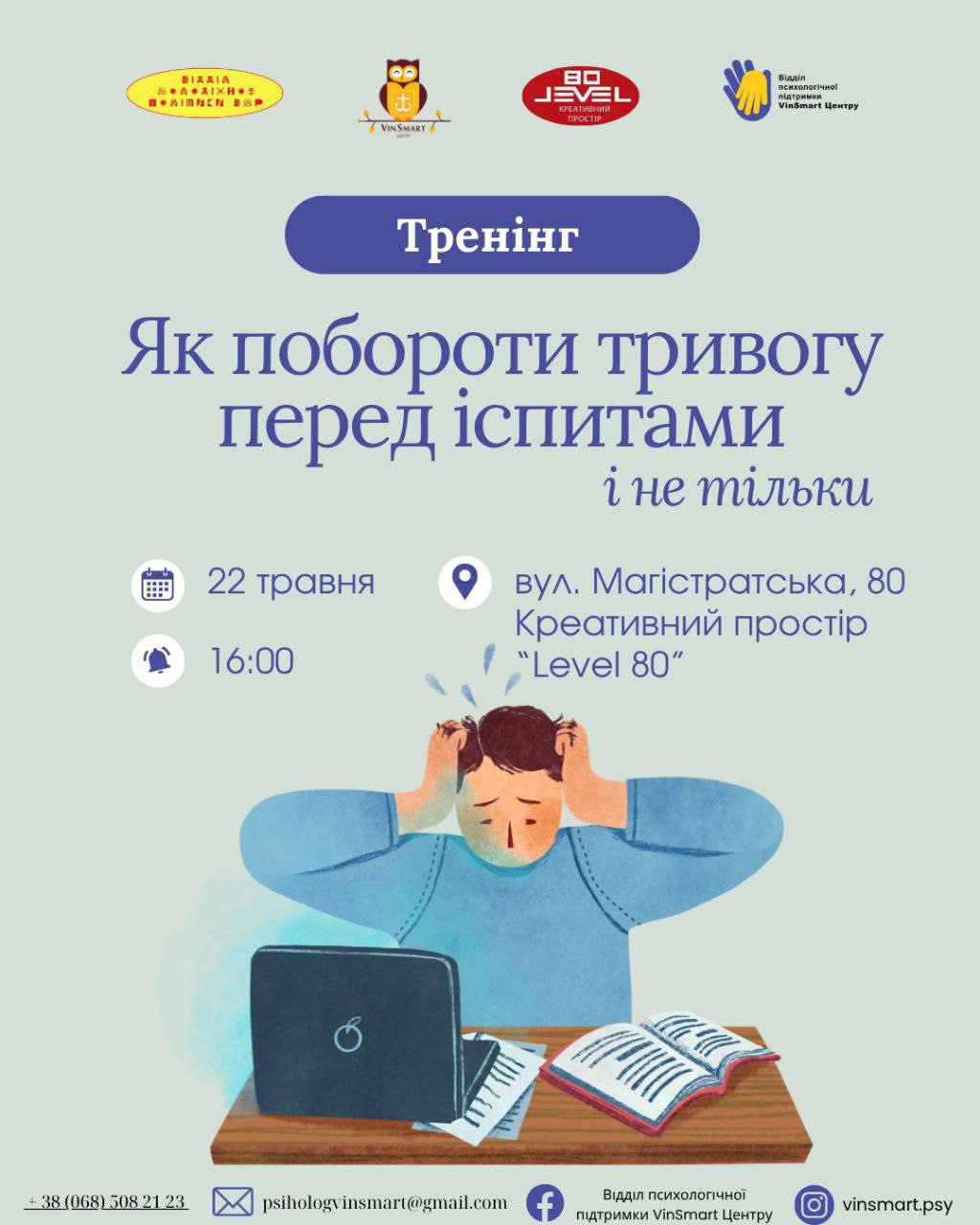 Як повідомляють на сайті Вінницької міської ради, у креативному просторі "Level 80" відбудеться практичний тренінг «Як побороти тривогу перед іспитами». Захід організований відділом молодіжної політики Вінницької міської ради, VinSmart Центром та відділом психологічної підтримки VinSmart Центру.