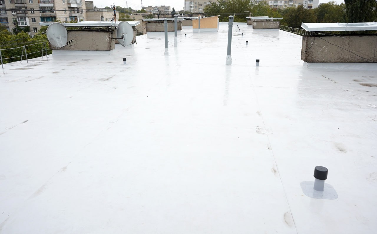 А на даху будинку на Ващука, 17 відремонтували вентиляційні канали, виходи на покрівлю, постелили нове покриття мембранного типу, зробили перильне огородження.
