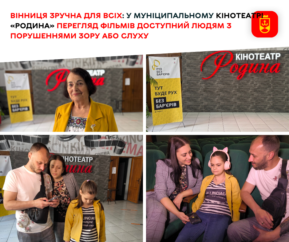 Прикладом такої ініціативи в дії є кінотеатр «Родина» у Вінниці, де вже близько двох років перегляд фільмів доступний для людей з порушеннями зору або слуху завдяки спеціальному мобільному застосунку. Цей додаток відтворює аудіодискрипцію – голосовий опис подій на екрані для людей із порушеннями зору, або приховані субтитри – для людей з порушеннями слуху.