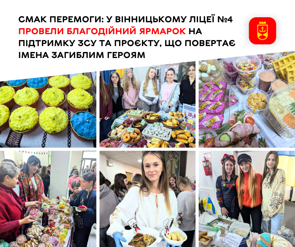 Голубці, вареники зі шкварками, холодець із хріном, оселедець на канапках з вінницькою гірчицею, пироги, авторські тістечка та заливний язик – у фойє ліцею №4 панувала синергія спільної дії. Батьки та учні приготували сотні страв, щоб зібрати кошти для Збройних сил України та підтримати проєкт з повернення імен прлеглим Захисникам та Захисницям, повідомляють на сайті Вінницької міської ради.