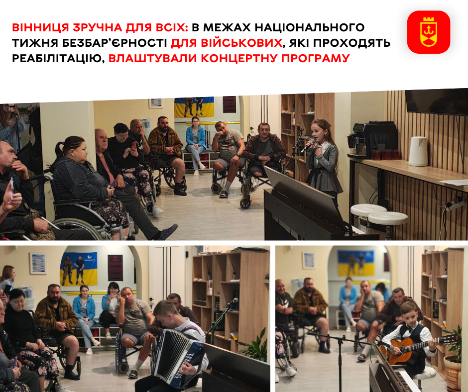 Як повідомляють на сайті Вінницької міської ради, у Вінниці, в одному з медичних закладів міста, відбулась концертна програма для воїнів, які проходять реабілітацію. Захід провели у межах Національного тижня безбар’єрності й він став символом вдячності й підтримки тим, хто боронить Україну. Підготували концерт для оборонців учні та викладачі Вінницької дитячої школи мистецтв «Вишенька» за підтримки департаменту культури та Вінницької міської ради.