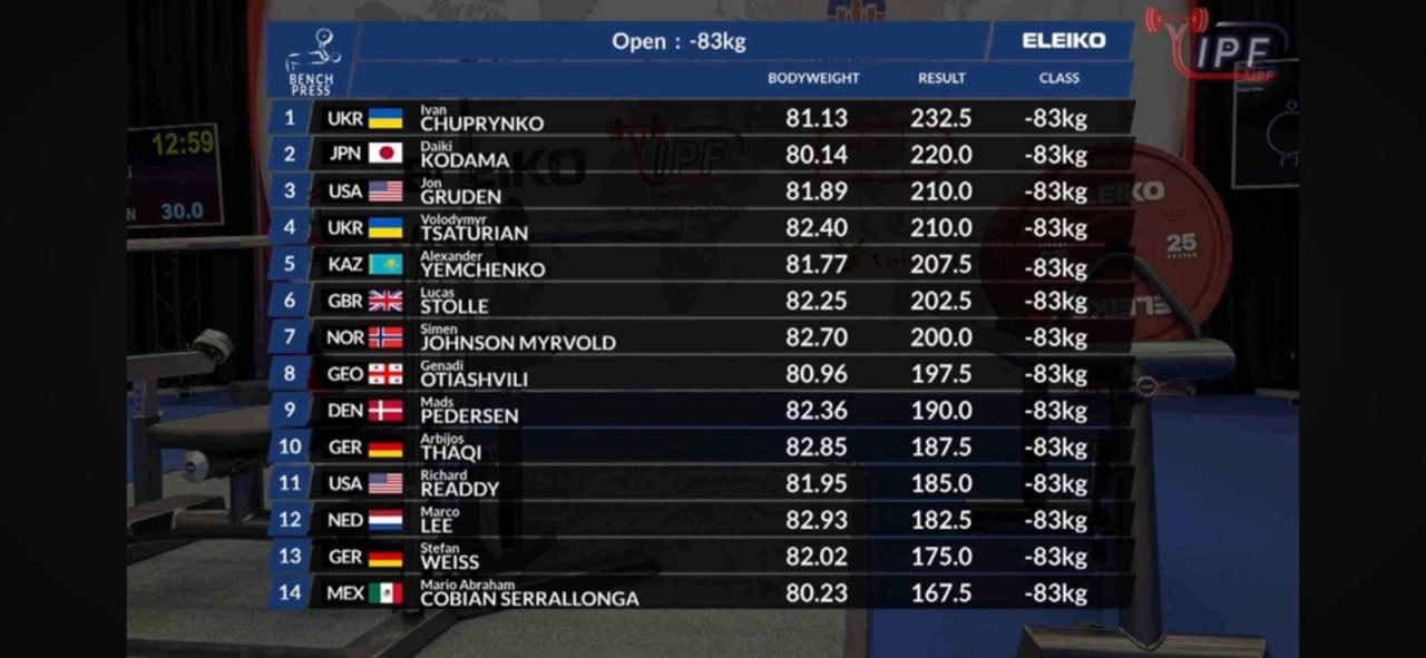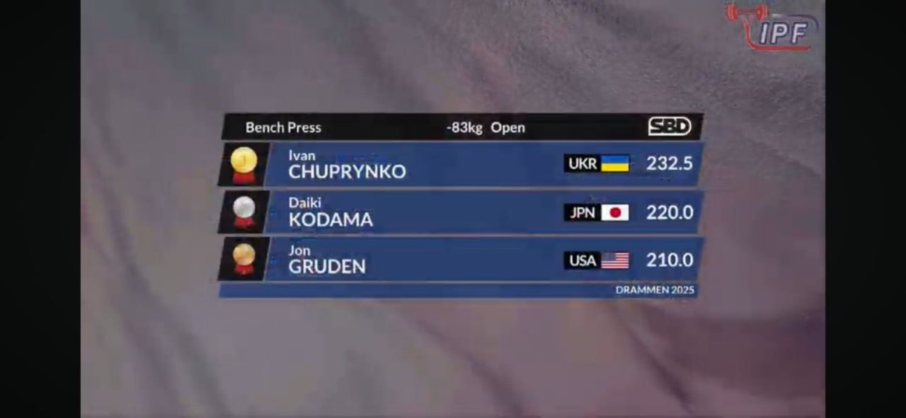 На Чемпіонаті світу у Драмені (Норвегія), що триває з 18 по 24 травня, Іван Чупринко здобув своє 13-те золото чемпіона світу у ваговій категорії до 83 кг та встановив 15-й світовий рекорд — 232,5 кг.
